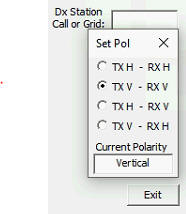 | Polarity Control Option: The Polarity Control option is only available in DrzTrack version 5.21, and controller version 5.22, or later versions. It's purpose is to provide a way to switch an XY antenna, such as a crossed Yagi, between Horizontal and Vertical operation. It can also handle automatic polarity switching for receive or transmit intervals when operating digital EME modes with one minute transmit and receive sequences (such as JT65 and Q65). When selected, the following window will be displayed in the