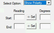 populated with instructions for calibrating the display. Here are the calibration controls: To calibrate, set the polarity to horizontal, enter zero degrees in the start degree field and then click the 'Set' button. The input voltage will be read and displayed in the 'Reading' field. Then rotate the polarity to 90 degrees, or whatever your end point will be, and enter that position into the End degree field. Then click the set button and get the reading for that position. Next click 'Apply' or 'Ok' to save the settings. Now the polarity in degrees will be shown on the main dialog.