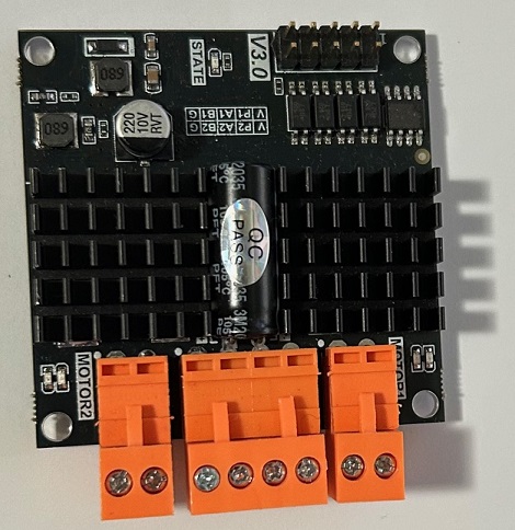 It can handle motors from 6.5 to 37 DC volts, up to 12 amps. The connections are similar to the others, the motor supply connects to the middle bottom connector and the motors to the two 2 pin connectors on either side. It needs +5 volts for VCC and does not require pull-up resistors. Note the small label near the connector that shows which pins do what. Note that there are pins labeled p1 and p2. They are for PWM input but are not used with the CT-2, The CT-2 does PWM through the input lines, via the JOG control. |