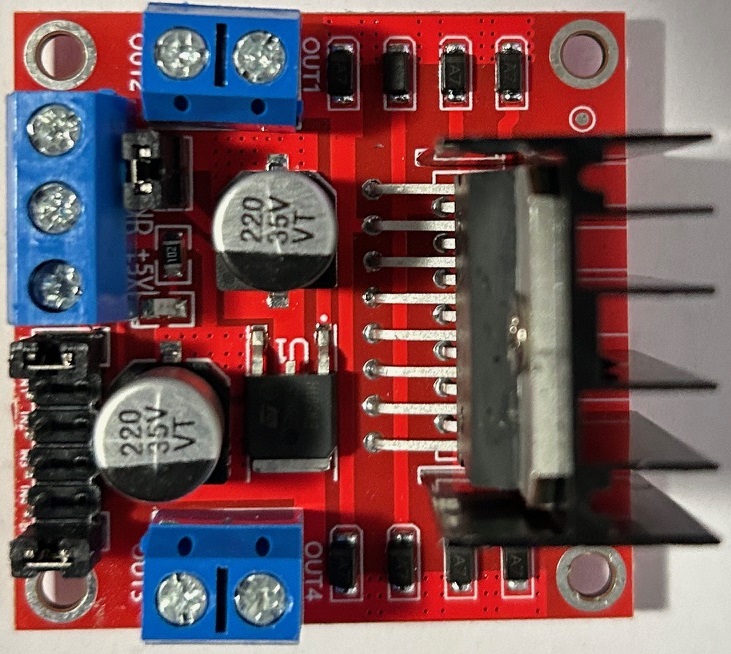 Note that the 10k pull-up resistors are wired to the two input pins of both of the two bridges. That is because the two bridges are paralleled to handle double the current. For normal operation four resistors would be needed. In this case I needed two separate bridges because the two motors use different voltages, 12 volts and 26 volts. So I used two dual bridges each wired in parallel, which also gave enough current handling to work with my motors. Going back to normal usage, the motor supply voltage is wired to the
